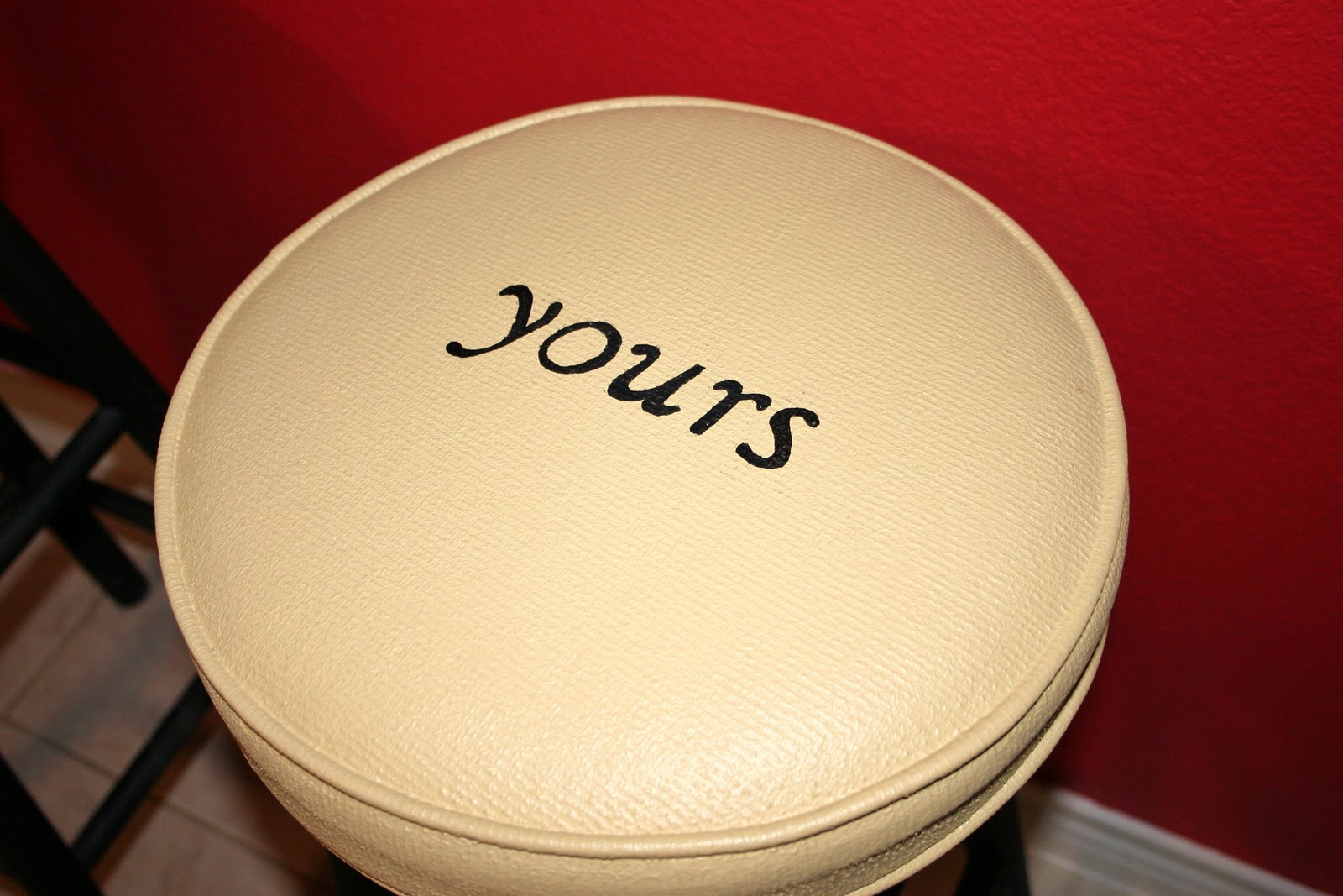 I recently finished a makeover on some bar stools I've had forever. I spraypainted the legs black, and I painted the fabric seat 2 coats Kilz and 3 coats paint. I decided if I messed up painting them, I could always just recover the top with a different fabric. Fortunately, I followed a great tutorial on Twice Remembered's blog which helped me from start to finish!
