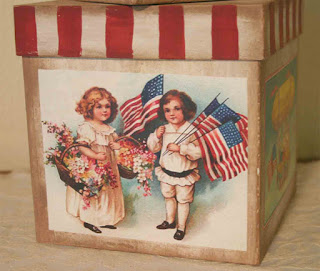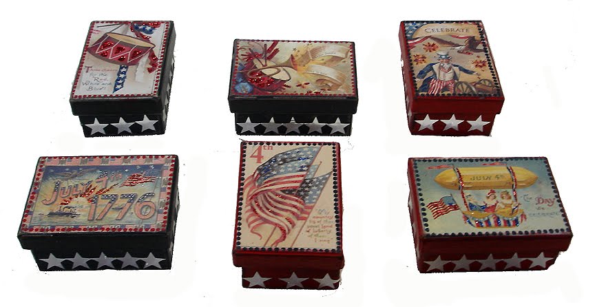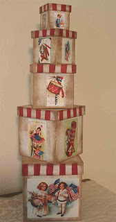 I painted them a parchment color and then used a brown paint wash technique to make it look vintage. I added some red stripes to the lids for a punch of color and then glued a different image to each side. The final result ....
