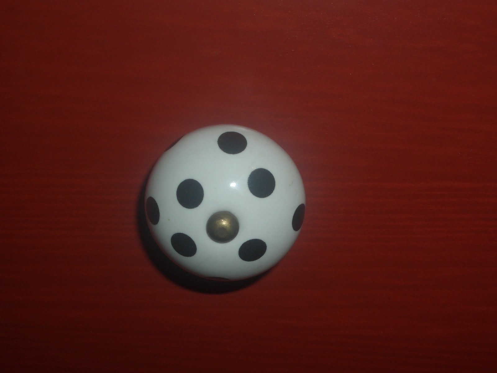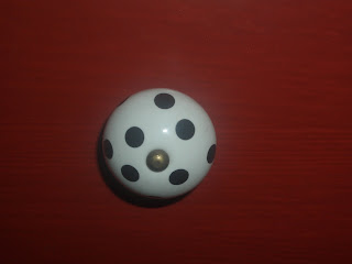 I bought this red dresser on Craigslist several months ago. I just recently changed the hardware to give it just a bit more character. Each knob is different ... a zebra stripe, a letter Z, a clockface with Roman numerals, a checkered pattern, a polkadot pattern and a fleur-de-lis.