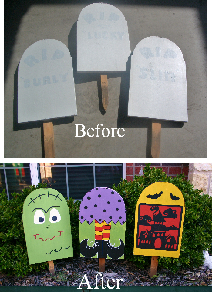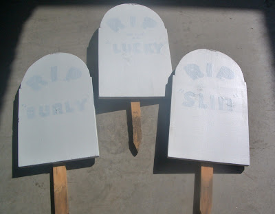I picked up these three boards at a garage sale last year for $5. I forgot to take a picture of them before I did the basecoating, but you can see how they were originally painted as tombstones.