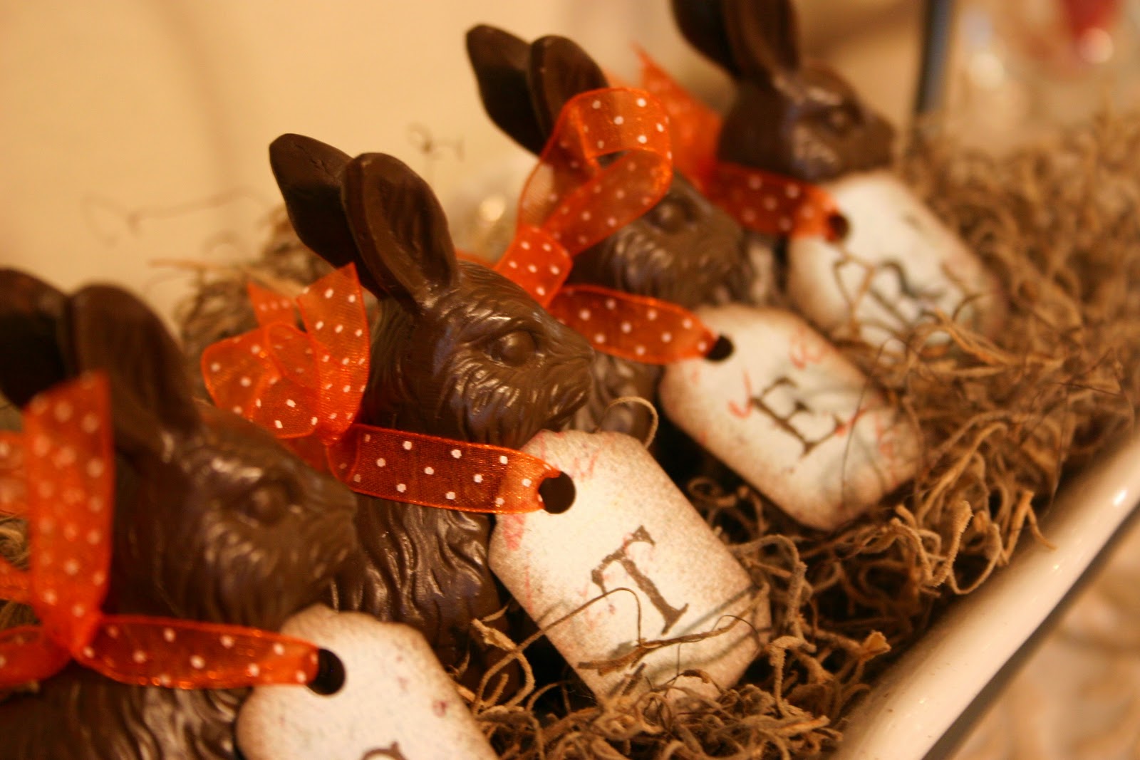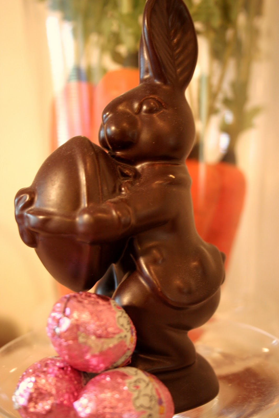 Last year I purchased several faux chocolate bunnies from a discount store and they make a great vignette on the buffet in our kitchen …